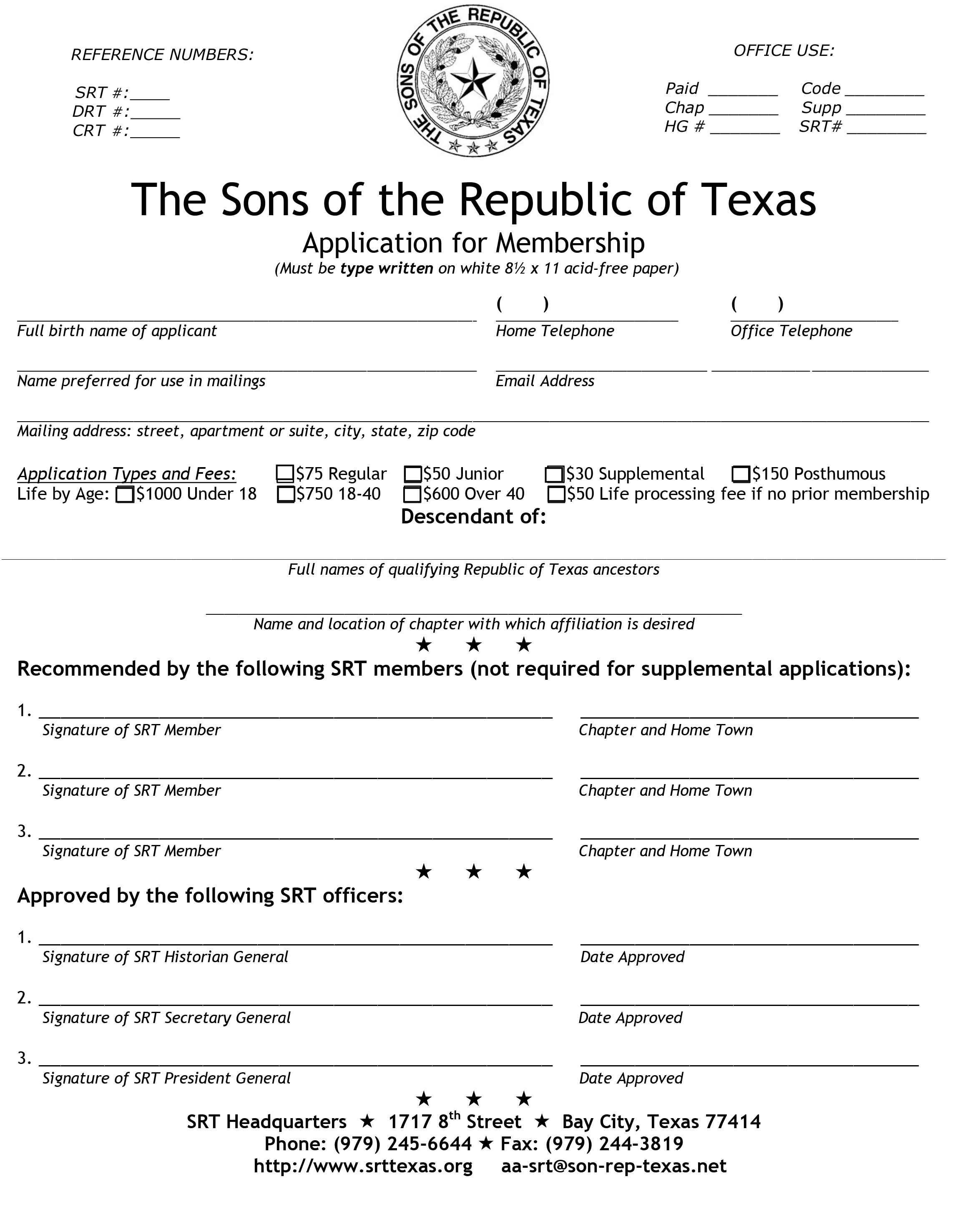 A male, who is a direct lineal descendant of a resident of the Republic of Texas prior to February 19, 1846, is eligible for membership upon submission of the appropriate SRT membership application, payment of the required fee and approval of the Historian General, Secretary General and President General.